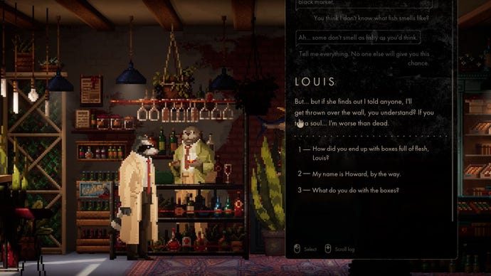 Backbone reviewBackbone is less the detective noir you might expect, and more a story-driven philosophical exploration of empathy. In either case, it’s very beautiful.Developer:EggNutPublisher:Raw FuryRelease:June 8thOn:WindowsFrom:Steam,GOG,Humble,Epic Games StorePrice:£20/€25/$25An important part of having a lovely time with something is setting your expectations correctly. Just ask the two old ladies who I once saw going into a screening of Zombieland and leaving after approximately seven minutes. So in that spirit, it seems important to tell you thatBackboneis not the point and click detective adventure game with all puzzles you might have thought it was.It’s more accurately described as a grim, philosophical, story-focused noir game about collectivism vs. individualism, dressed up in the tropes of a detective puzzle game. Like The Good Place with more depression, orDisco Elysiumwith raccoons.Watch on YouTubeBackbone isn’t as unrelenting or dense as Disco Elysium, but it progresses in a similar vein. About halfway through, for example, the detecting/solving a murder bit gets, for all intents and purposes, dropped entirely. And I won’t spoil the specifics of this transition (which are incredibly,incrediblyweird) but I do think it’s important you know that up front. Backbone is a good game, but if you were expecting something more likeMonkey Islandmeets Zootopia then you might end up with some buyer’s remorse.Backbone does want you to get into the mindset of a detective to start with, though. In the first part of the game, you’re doing a bunch of skulking around as betrenchcoated raccoon Howard Lotor, following leads and collaborating with a cool investigative journalist (who is also a fox). You’re initially digging into the suspect activities of a nightclub owner (who is also a bear), including blackmail, drugs, and good old fashioned organised murder. The puzzles in these early sections are good, and while some don’t really let you fail, a few of them are fabulous. Like figuring out password reset answers to brute-force access to a PC, or deciphering someone’s clues for remembering a keypad code. If EggNut wanted to make a full-blown puzzle game, they’d probably pull a blinder.But these elements are gradually phased out as you carry on playing, until eventually you’re fully in fever-dream-full-of-metaphors territory. There is a point in Backbone that I guarantee will make a lot of people mutter, “Wait,what?”, which represents the final nail in the puzzle coffin. Once I shook off the surprise and got in the right headspace, though, I was still picking up what Backbone was putting down.What do you think the marquee reading CALL MOM represents??It pulls off the noir tone throughout, but its central point does feel laboured after a while, and there are a couple of events in there that I couldn’t quite understand, either on a metaphorical or literal level. Backbone also has that vague “animal species as allegory for racism” flavour - rodents are rarely allowed to be scientists, gorillas are in charge of everything, and most people dislike raccoons, for some reason - in a way that’s ultimately so surface level that it may as well not exist to incur the slight eyebrow raise that it does.But I’ll largely forgive Backbone these missteps for two reasons. The first is that the dialogue in Backbone is smashing, regardless of whether you agree with the ideas contained therein. The loops get a bit tangled a couple of times, but for the most part having a chat with someone in Backbone is one of the best, most natural conversations you’ll see in a game. Your potential responses or questions will change depending on what you just asked or what the other character just said, and it all flows in a realistic way. Howard as a character exists in flux, and it’s your choices that can confirm him as empathetic, hopeful, or mired in self-pity and a vague existential guilt. This is exemplified in the little talks you have with Anatoly, an old friend whose wife is expecting their second child. You can choose to ask fully engaged questions about his family, or just bluntly not care unless it’s in relation to your own life.Look at this stuff, how can you not love it?The second reason that I will let Backbone get away with small irritations, is that it looks absolutely fantastic. Set in a sort of futuristic Vancouver, now a giant walled city in a post-apocalyptic wasteland, Backbone provides some cool 2.5D cityscapes rendered in extremely lovely pixel art. The depth to every scene, with distant buildings parallaxing along in the background and plants and junk doing the same in the foreground, almost makes everything feel fully 3D. Of particular note is the lighting: late afternoon sun spilling in through unseen windows, shop signs shining out of the darkness, and campfires throwing the characters around it into relief.And then there are the dreamy, pulpy illustrations that open new chapters. Oh, be still my beating heart. Backbone is quite possibly the most beautiful game you’ll play this year. Sometimes style over substance is a valid approach. Not that Backbone is devoid of substance either, of course. But be prepared for that substance to have a very different texture than what you were expecting.
