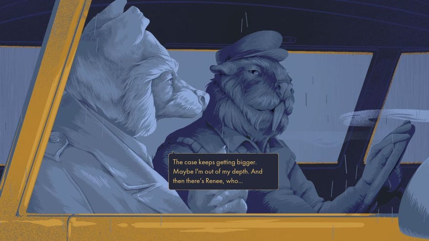 Backbone isn’t as unrelenting or dense as Disco Elysium, but it progresses in a similar vein. About halfway through, for example, the detecting/solving a murder bit gets, for all intents and purposes, dropped entirely. And I won’t spoil the specifics of this transition (which are incredibly,incrediblyweird) but I do think it’s important you know that up front. Backbone is a good game, but if you were expecting something more likeMonkey Islandmeets Zootopia then you might end up with some buyer’s remorse.