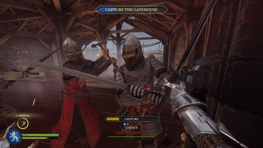 It’s very straightforward. You’re a medieval soldier and you’re desperate to chop limbs off. Battles take place in three flavours: 64-player, 40-player, or a “free-for-all” mode (used to best effect in servers running duelling matches with their own etiquette). Team battles often see an attacking side storming across large maps to complete objectives, while defenders try to stop them. For example, one foggy map has the attackers pushing a caravan toward a distant castle. Along the way they must destroy barricades, capture a gatehouse, and storm walls. Finally, they must kill the duke, a player assigned (I think) at random, whom the defenders need to rally around in a last stand.
