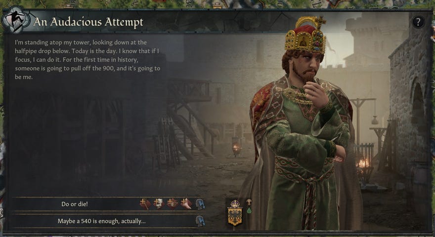 Availablefrom CK3’s Steam Workshop, Tony Hawk’s Pro Crusaders 1 + 2 lets rulers pick up the new lifestyle trait Skater. Hit the skatepark and you can both level up your skillz and relieve some stress. It adds new skating-related events too, from going for the world’s first 900 to encountering a rival at the skatepark.
