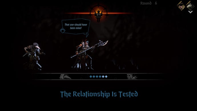 I’m told that the development of these relationships was a natural extension of the affliction system in DD1. The characters used to be a means to an end, so stress mostly affected just the one hero. But with DD2’s new affinity system, characters can become fast friends, or faster enemies, depending on how they react to each other’s decisions. This often leads to a lot of bickering.