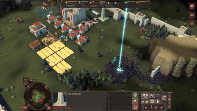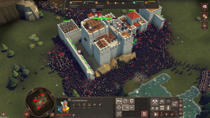 Plonked at the centre of the map and initially exposed on all sides, your weedling town hall needs encircling with as many defensive towers, gates and crenellations as you can build before the next wave arrives. These waves come thick and fast, with increasingly aggressive enemy forces eventually numbering in the hundreds and thousands of units, until they’re flowing between buildings like meaty rivers and crashing up against your defensive line like, well, waves.
