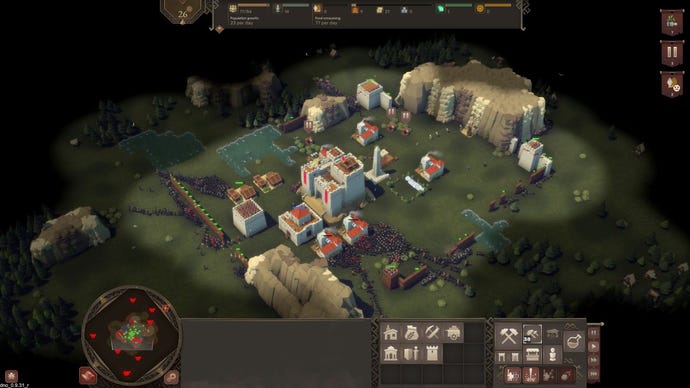 In the moments of respite between attacks you’ve got a precious handful of minutes to expand your town with more homes for settlers, more farmlands and fisheries for food, and resource-generating buildings like iron mines and lumber mills. As your storehouses fill up with stuff you can upgrade your structures from wood to stone and expand your growing army with better equipped units and weapons. You can build a hospital to prevent the corpses of fallen soldiers festering where they fell and causing a plague, and you can hire gravediggers to properly bury the dead so that they don’t reanimate as vengeful zombies.