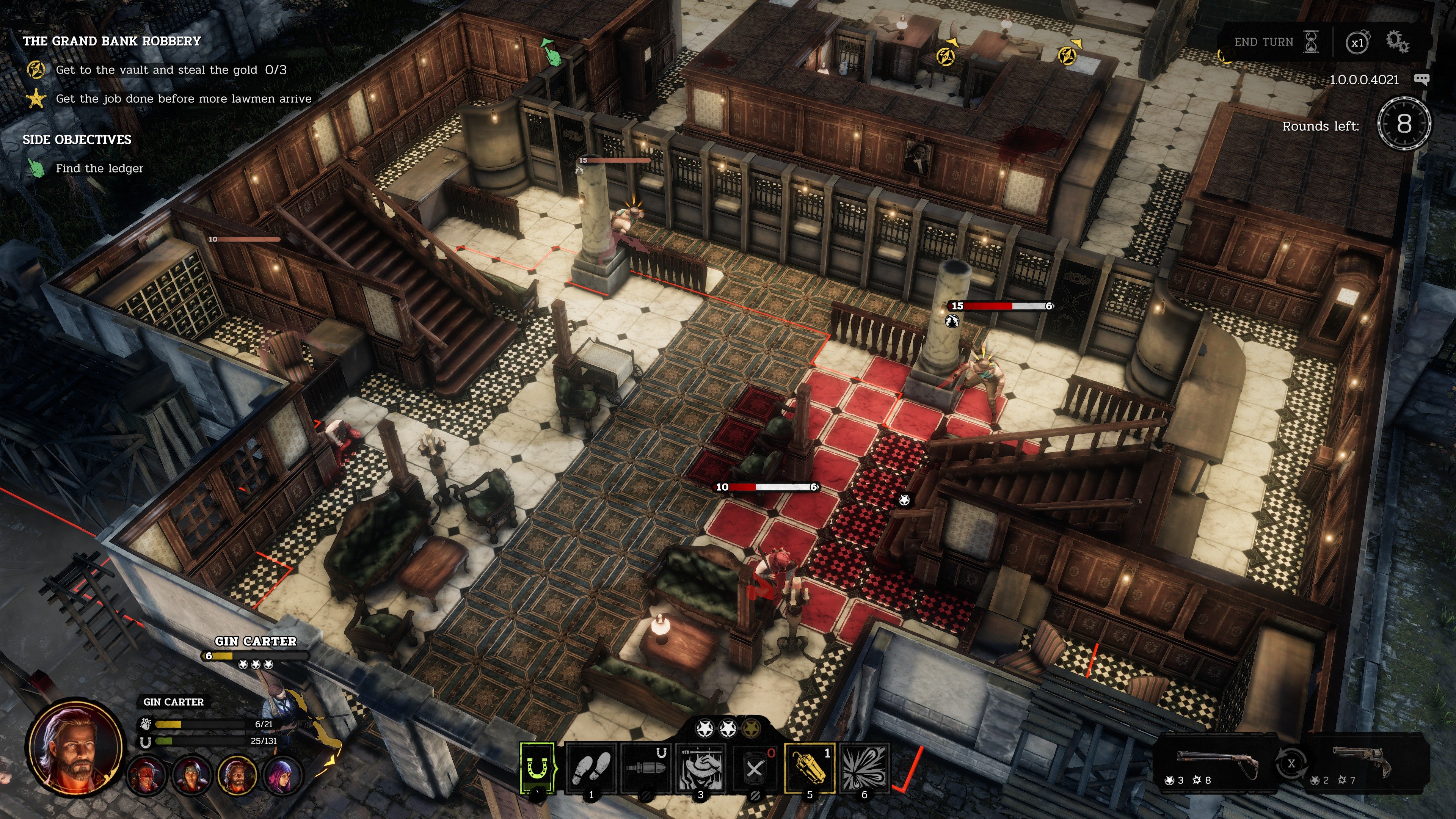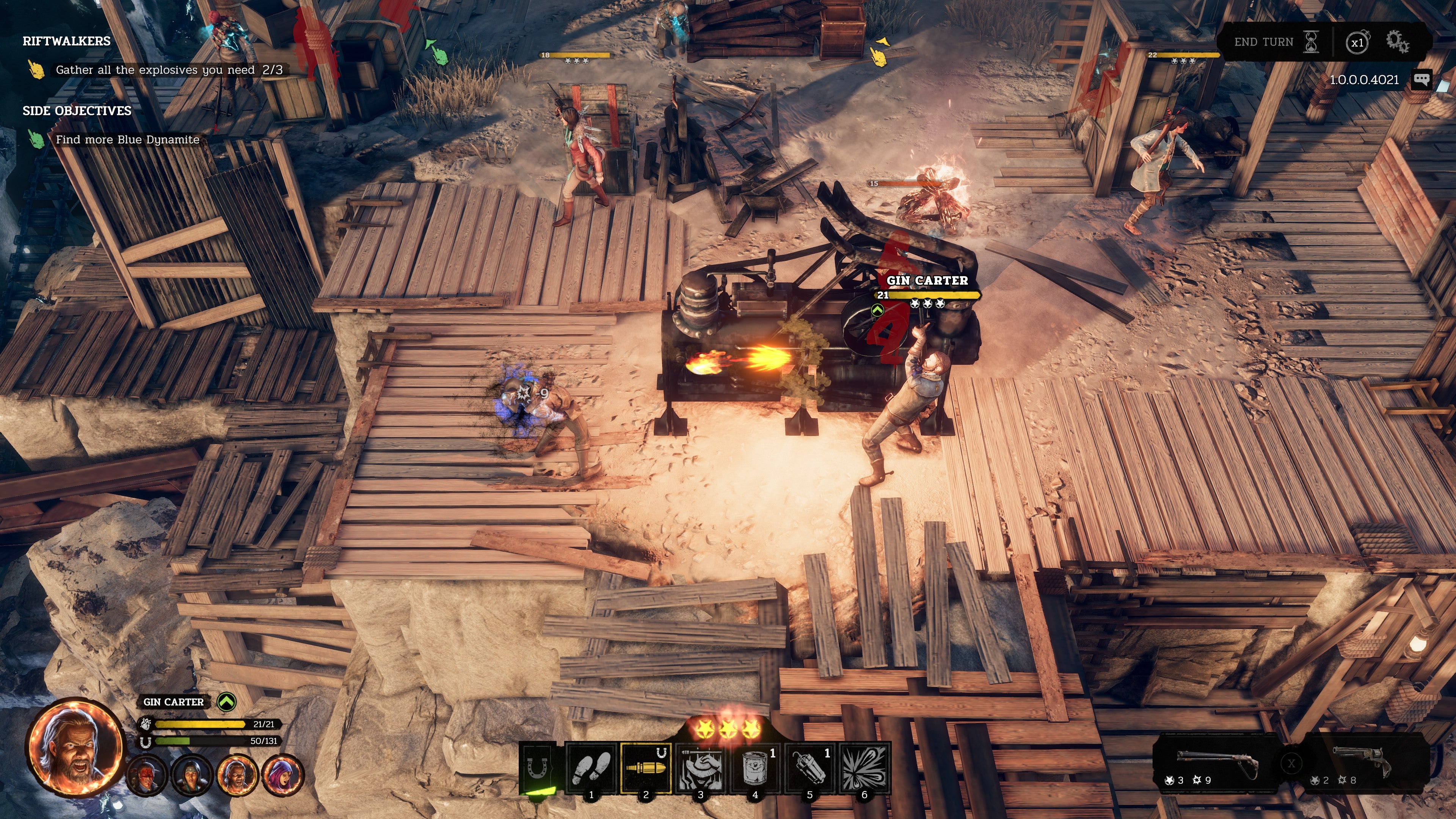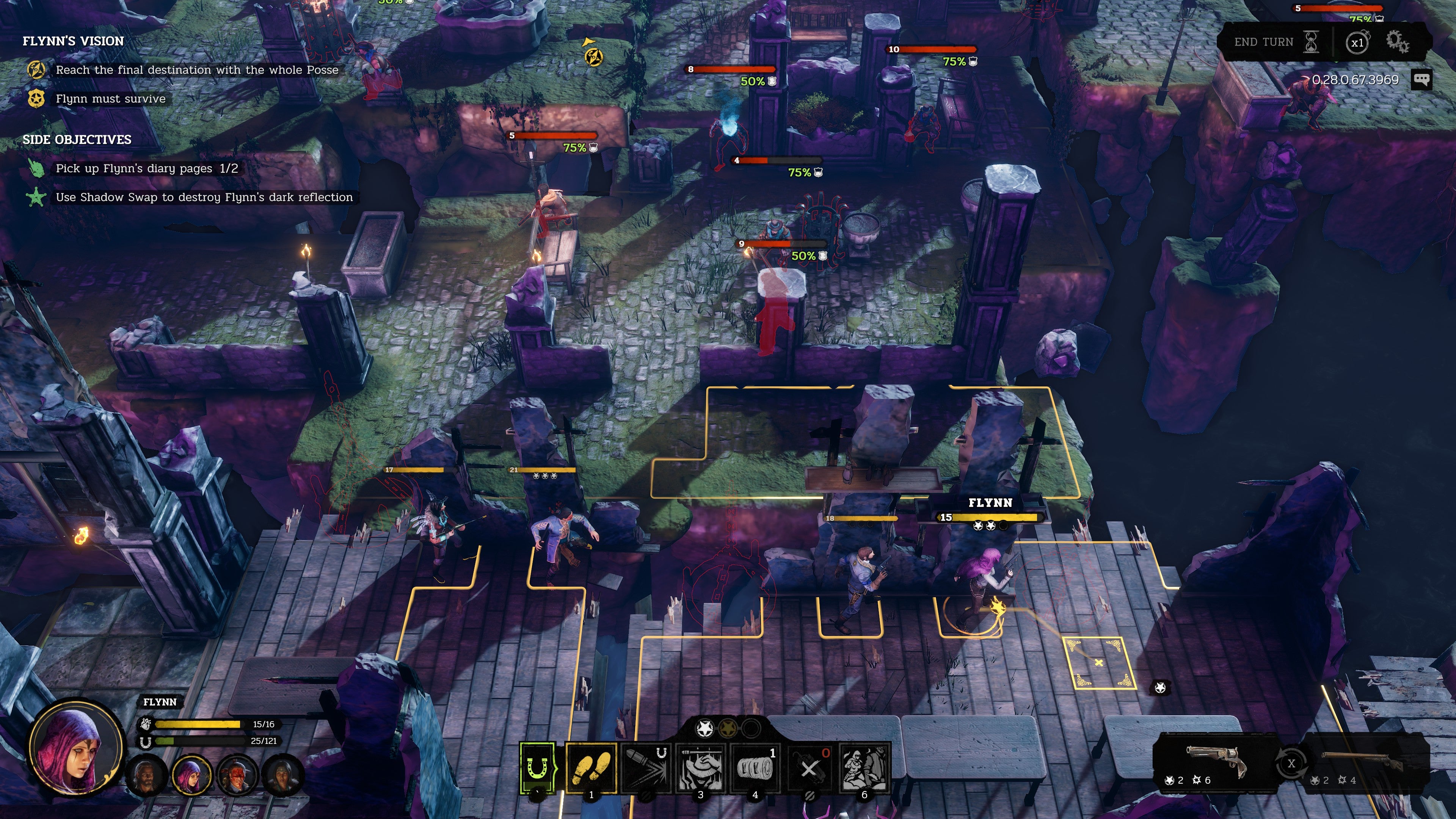 Luckily, Bravado is not the only tool in your arsenal. All characters can perform trickshots with pistols, ricocheting bullets off metal objects to circumvent enemy cover. In addition, each character has a unique skill that can help even the odds. Gin can fire a barrage of bullets through cover, damaging anyone standing a certain distance in front of him, while Laughing Deer can perform a “Wild Run” that increases damage dealt for every two squares that he moves. Perhaps most unusual is Flynn, whose occult powers let her swap positions with anyone on the map for a small health cost.