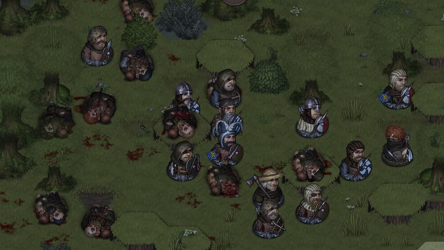 I hire all the feeblest, cheapest fighters I can. The desperate and the downtrodden. My unofficial battle leader is Hilmar, a former jester. He frequently instigates antics when we’re in a town or at camping, doing increasingly dangerous and unnecessary stunts, just daring death to take him while the game repeatedly asks me if I’m going to step in. I do not. He is Hilmar. He fights on the front line, still wearing the jester hat he came to us with. Almost any other form of headwear would offer more protection and be more appropriate for a normal mercenary company. But every time someone bashes Hilmar, the hat jingles, and he survives again, against the odds. He will die one day, probably from a single blow to the head. I will never take his hat.