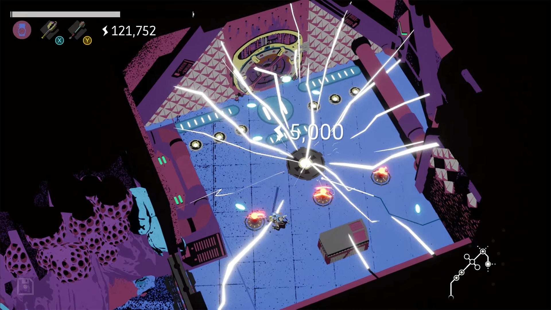 You do that with two tools: one that charges your balls and one that strikes them. The more energy you put into the balls, the more damage you’ll deal to these bumpers that you’re trying to destroy so you can progress to the next area. Naturally, as you move through the game you’ll also grab fancier tools, like the charge tool that also has an aim assist and the whacking implement that splits a ball into three for maximum hittage.