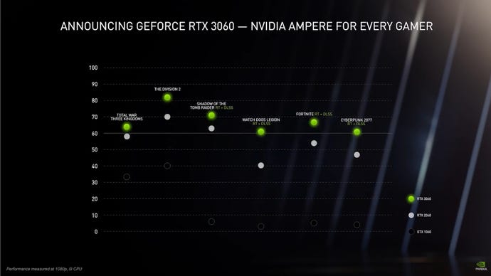As you can see, in the two games that don’t have any ray tracing and DLSS gubbins tacked on (Total War: Three Kingdoms and The Division 2), the RTX 3060 looks to offer nearly double the performance of the GTX 1060, making it a good upgrade option for owners of that particular card.