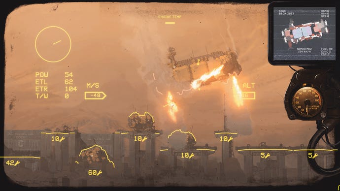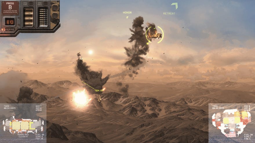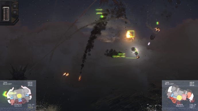 The campaign side has its draws too. Downed enemy ships leave you with a crash site you manually salvage, sending your crew out to recover specific elements like fuel, guns, hull parts, intel, or even rescuing bailed out enemies. How much you can recover varies, and some sites are hazardous, asking you to risk your crew’s lives or spend precious time suiting them up. And these sections happen in real time, so you can leave your people to it while you direct other ships on the map, or zoom in and watch as the bland blue map readout changes to a live satellite feed, with visible clouds, fire, night/day cycles, and every ship you launch leaving a chemtrail that has its own shadow (doubling the frustration that 95% of map time is spent on the ugly flickery zoomed out angry admiral’s foot fodder mode). Best of all, if you down a cargo ship’s escorts it’ll surrender, and you can fly it back to the nearest settlement and sell it off. A large part of the game, in fact, is based around tracking down these cargo ships and essentially pirating them to fund your war. It’s got salvage! It’s got piracy! These are the exact things I want!