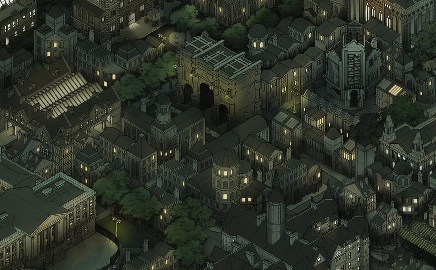 “To try and pin down the space geographically is a bit of a nightmare,” Arendt explained to me, when he showed me the in-progress artwork a few months ago. Arendt is a calming, broad-shouldered presence in Failbetter’s office, much given to sitting with his arms comfortably folded, and he’s been at the studio since its inception. “We’ve had a few goes at it,” he added - and no wonder. Over the years, the game’s writers have added location after location, meaning a never-ending programme of urban renewal for the theoretical city.