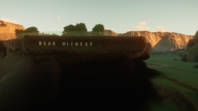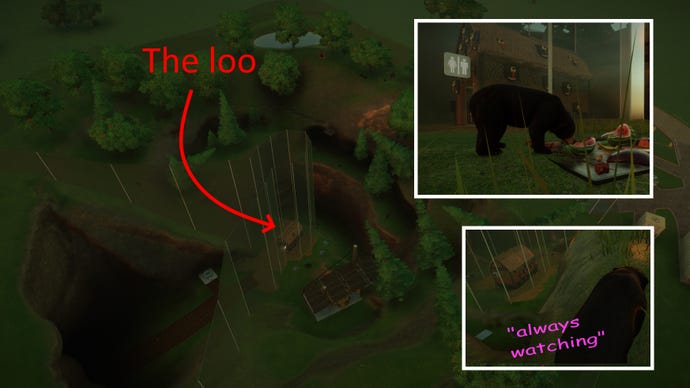 An aerial view of Bear Witness, with some inset shots of the ever-present, lolling tongued bears who spectate every poo that takes place there.