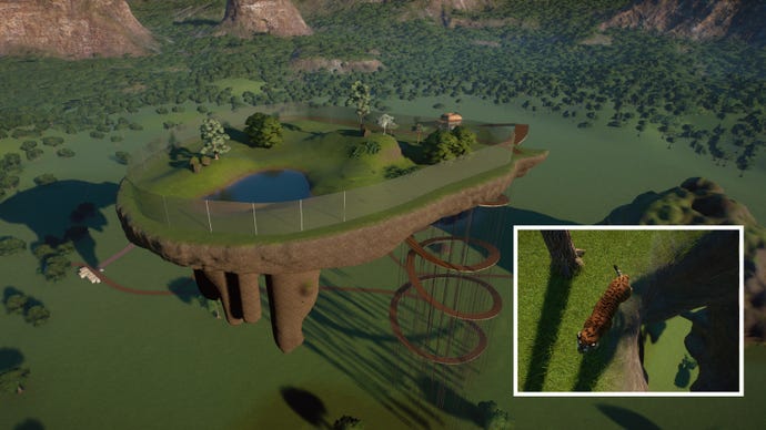Upsettingly, I couldn’t get the game’s offline market to sell me a clouded leopard for love nor money, so I’ve put this tiger in there for the time being. I hope he doesn’t fall down any of the pits I’ve drilled through the island.