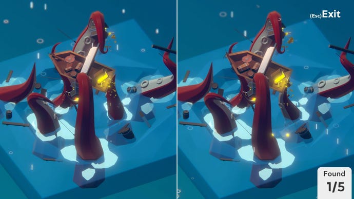 What I enjoy most is that each level has sound, as well. The kraken has wood rending noises, while the fishing has gentle splashes. In scenes where its' raining, you often get the gentle pitterpatter of the drops hitting the ground. It’s all tremendously relaxing. Even the differences push you towards a low-key kind of looking. You’re not looking for things that aren’t there in one scene, you’re looking for things that are a different size or colour, or have moved, so you end up relaxing your gaze to take in the whole thing, until you snag on something a bit wrong.