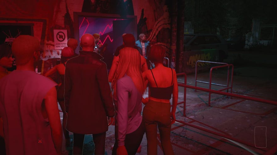 Oh, IO interactive, you clever sausages. You’ve not only stagedHitman 3’s Belly of the Beast narrative phase in an allegory for the underworld, set up a Steppenwolfian-threshold to a hedonistic pit and beautifully referenced Blood Money’s ‘Heaven and Hell’ stage, but you’ve got a mural running parallel to the queue that shows a murderous, vengeful devil pushing their way through the throng of faceless, background shadows.
