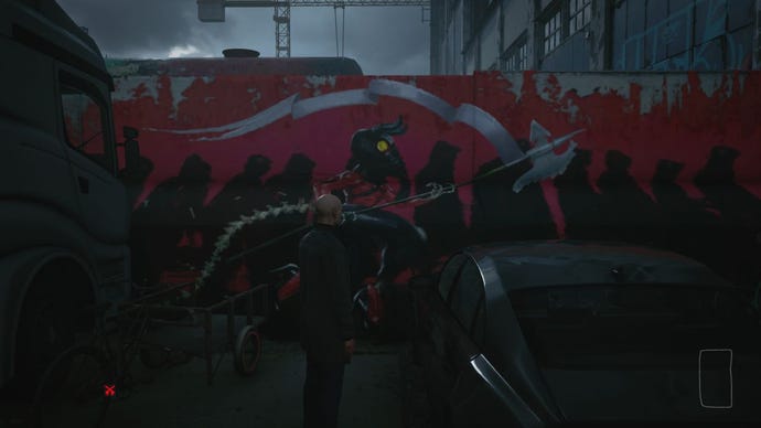 Ian “Agent 47” Hitman is a social doppelganger, built for the purpose of dishing out just desserts to awful people. A sort of ‘Karma Chameleon’, if I may coin a phrase. The Hitman has no issue mingling with oil barons, fashion moguls, and arms dealers at private parties. Trying to navigate the esoteric rules for getting into a Berlin techno club, however? All the disguises in the world are so much currywurst and Club-Mate vomited behind a bin if, for whatever reason, the bouncer simply doesn’t like your stupid bald face.Hitman 3 is a Mostly Great End to the World of Assassination Trilogy | Hitman 3 ReviewWatch on YouTubeBerlin isHitman 3’s best level. The pathway to the industrial warehouse turned hedonistic wonderland is the sort of lead-up you’d expect to end in a gothic manse, more Castlevania than Kraftwerk. Blackbirds circle overhead, the music is ominous, and a pale light beckons 47 forward. When you reach the club, it’s part underworld allegory, part subversion of the Hitman formula, and part just IO Interactive showing off. Before all that though, 47 has to indulge in some of the utter mundanity the series does so well; it’s time to join the queue.“It’s during this period of extended waiting that 47 starts to get a bit nervous about his social skills, and decides he needs a ‘thing’.“The queue is - predictability - glacial, likely a result of the doormen repeatedly performing their arcane rituals on every prospective entrant to confirm that, yes, they secrete the secret techno sauce, and may pass the threshold. It’s during this period of extended waiting that 47 starts to get a bit nervous about his social skills, and decides he needs a ‘thing’; a type of club ‘guy’ to be that will allow him to pass off any murdery quirks as charming eccentricities.After some soul searching, and also bin searching, 47 decides on ‘guy who carries an iron about’. The possibilities are endless. An evolution of the ‘brush dirt off shoulders’ move? Letting out blasts of steam on the drop? Oh, you like getting a backrub while you’re coming up on two and half Mitsubishis? Ameteur hour. This bald adonis will iron your actual clothes, while you’re still wearing them.As you do when you’re in an interminable queue, 47 takes in his surroundings.Oh, IO interactive, you clever sausages. You’ve not only stagedHitman 3’s Belly of the Beast narrative phase in an allegory for the underworld, set up a Steppenwolfian-threshold to a hedonistic pit and beautifully referenced Blood Money’s ‘Heaven and Hell’ stage, but you’ve got a mural running parallel to the queue that shows a murderous, vengeful devil pushing their way through the throng of faceless, background shadows.Yes, ok, I did take mine already. It’s a long queue.As 47 approaches the entrance, I hear a bloke inside screaming the word ‘cocaine’ three times, increasingly loudly. Once, in real life, I was once sitting on a sofa in a Berlin club watching two lads rack up powder on a credit card when a very large bouncer walked up to them. He slapped the credit card away, but instead of kicking them out, he just shouted “Toilet” at them in a very thick, commanding German accent. Party how you want, is the idea, just at least pretend to be the tiniest bit subtle about it. I’m not sure how long the screaming bloke would have lasted.With enough ‘small camera stickers’ you could probably asphyxiate someone.On the authenticity front, though, this ‘put a sticker on your phone camera’ thing is 100% real.