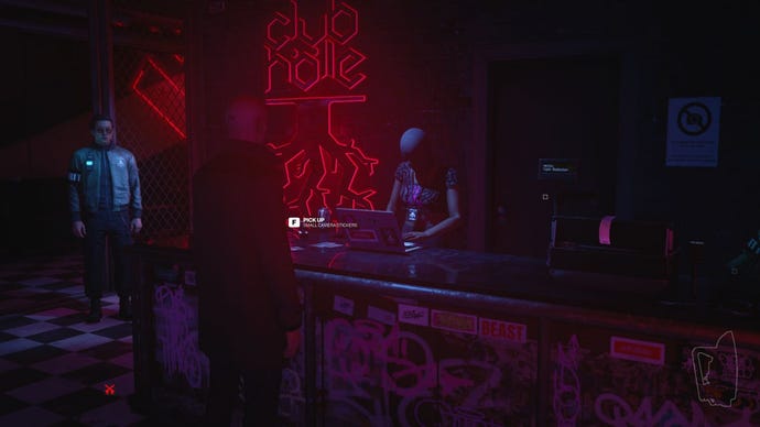 The queue is - predictability - glacial, likely a result of the doormen repeatedly performing their arcane rituals on every prospective entrant to confirm that, yes, they secrete the secret techno sauce, and may pass the threshold. It’s during this period of extended waiting that 47 starts to get a bit nervous about his social skills, and decides he needs a ‘thing’; a type of club ‘guy’ to be that will allow him to pass off any murdery quirks as charming eccentricities.