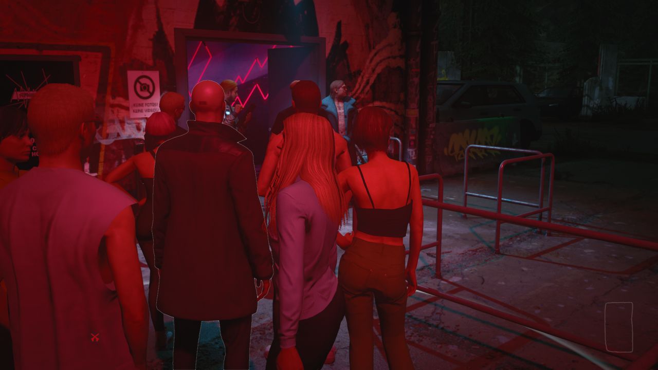 The queue is - predictability - glacial, likely a result of the doormen repeatedly performing their arcane rituals on every prospective entrant to confirm that, yes, they secrete the secret techno sauce, and may pass the threshold. It’s during this period of extended waiting that 47 starts to get a bit nervous about his social skills, and decides he needs a ‘thing’; a type of club ‘guy’ to be that will allow him to pass off any murdery quirks as charming eccentricities.