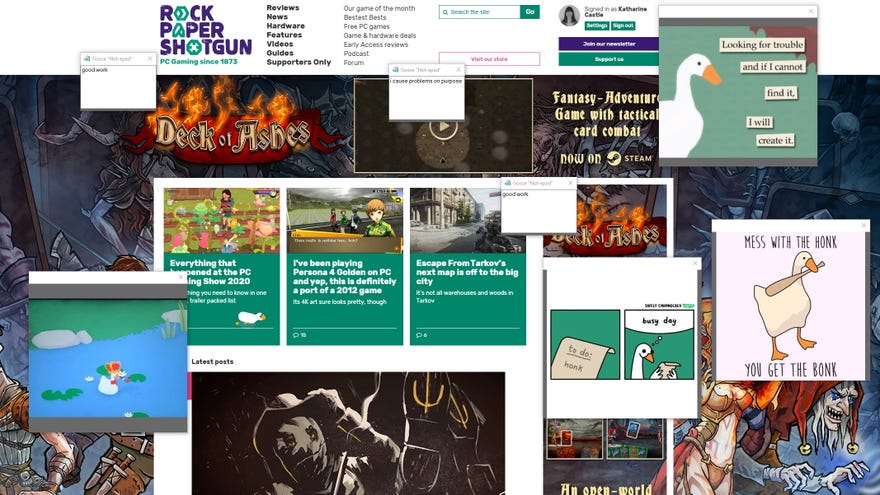 To be clear, Desktop Goose is, for the most part, incredibly ominous. When he first waddled onto my desktop, it wasn’t long before he pulled in a notes saying, “i cause problems on purpose” and “mess with the honk, you get the bonk”, and I was starting to regret ever hatching his little batch file into existence. Even worse, he’d peck at my mouse cursor if I tried to close any of this text and pictorial based handy work, which is not especially helpful when you’re trying to get a day’s work done.