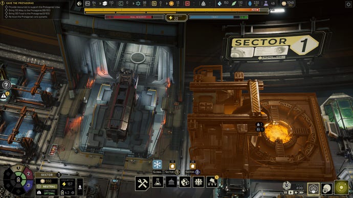 At this layer alone, Ixion is a perfectly decent management sim. Balancing the needs of your population with the space and resources available to you makes for some engaging plat-spinning, while setting up a new logistics route and watching all your automated robots pour out of the relieving stockpile is always satisfying. The portrayal of life aboard the Tiqqun is a little sterile, however. Buildings bear a reasonable amount of detail, but your human workers wander aimlessly along pathways. It’s a far cry from the intricate, characterful animation of the Two Point series. This isn’t too much of a problem, though, because most of Ixion’s personality lies elsewhere.