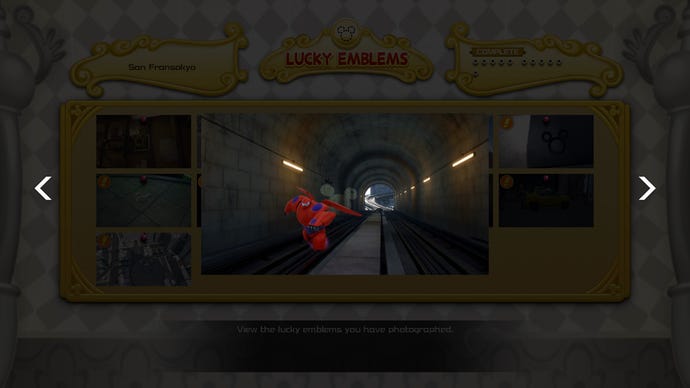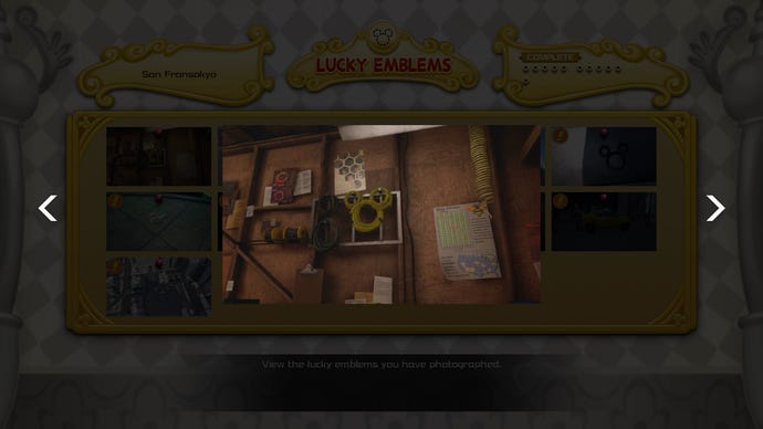 Off to Big Hero 6 now, and the sprawling metropolis of San Fransokyo. The first Lucky Emblem can be found in Hiro’s room. Look up at the wall and you’ll see some yellow wires in the shape of Mickey’s head.