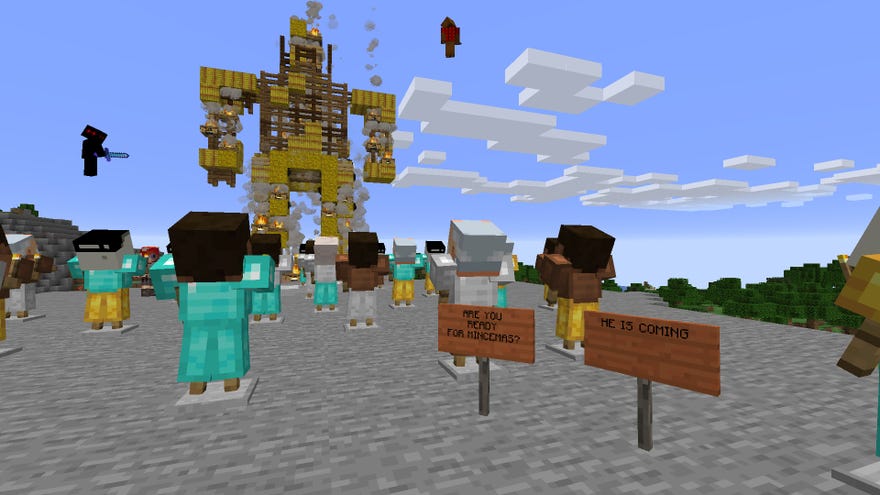 Earlier this week, after remembering that I’d populated the RPSMince Raftserver with thirty-odd mates from Twitter and then forgotten about it for four months, I put together an impromptu archaeological expedition, and went in to find out what the hell happened in there after it went dark. InMonday’s post, we poked around the chaotic ruins of the server’s derelict spawn town, where we found a bouncy castle, a giant “mincemas” gift (full of mince), and an underground den we could only deem “the bone room” before leaving in a hurry.