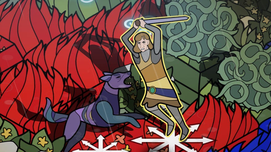 Pendragon’s rendition of that is, of course, nicer to look at than anything made out of an empty Fairy Liquid bottle. The game looks like a stained glass window, with strong black outlines and characters and monsters alike divided into key shapes in contrasting colours. I’m particularly fond of the palette on giant rats, for example, or the mix of greens on thick grass. Ruined abbeys feel echoey and melancholic, a remnant of Camelot’s once-glorious past, and woods can be deep and dark and full of terrors.