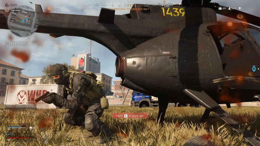 Nate is in the pilot seat. We fly as high as we possibly can, and just chill for a bit. Verdansk spills out beneath us, and we listen to the distant echoes of gunfights that are no longer our concern. We don’t have to worry about fuel, because we’re in a magical warzone where fuel doesn’t exist. We do have to worry about the other people in helicopters, who do exist, and do also have much bigger guns.