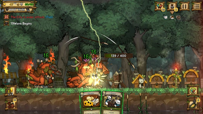 When the game starts you draw a hand from a deck of cards, and can draw more on a cooldown timer. Efficient, quick use of these cards is essential, because they let you deploy forces to your left and right fronts, unleash special attacks, construct new buildings, upgrade your settlement - which is spread across a 2D plane - and build new defensive walls farther from your town. Your cards are also the basis of your economy at the start of a run.