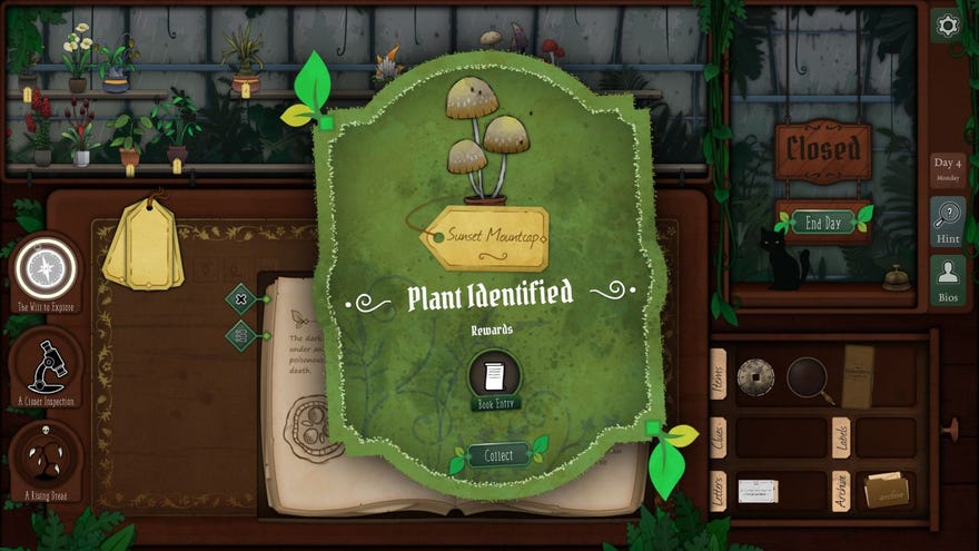 No auto-labelling for me, no: I will carefully catalogue all the plants you bring me. I will move pots around on shelves and inhale different scents. I will know which of these flowers is poisonous and which is the antidote. I want an endless shop mode where I sit in the shop, listening to the rain outside, and sell someone a Sunset Mountcap, explaining that it is sometimes called Stinking Mountcap, and pointing out the telltale flies that circle it. I never thought I’d say this, but: murder mystery be damned. The plants are fine, so what do I care?