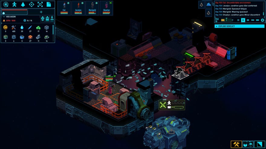 It’s a welcome change of pace, taking all of the complex, interconnected systems of a colony management simulator and sticking them in a big metal box that zooms through space. You’ve got the familiar and ruthlessly simulated wants and needs of your inhabitants to contend with. Each member of your crew is cursed with the ability to feel discomfort and sadness. They come with their own traits and skills, making them more or less proficient at operating parts of the ship and more or less compatible with their colleagues.