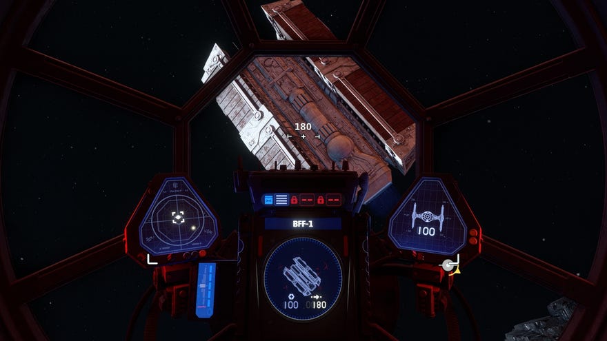 My first mission inStar Wars: Squadrons(which I shall now call Squadwarns for the sake of ease), saw me jumping into a TIE fighter to have a nose around a big asteroidy space dock thing, looking for refugees from the recently-burst planet of Alderaan. My space boss reckoned those refugees might be hiding in cargo transports, so he told me to scan some cargo transports. ‘That looks familiar’, I thought to myself, as I approached one of the big, blocky things. I’d seen that ship design before, you see.