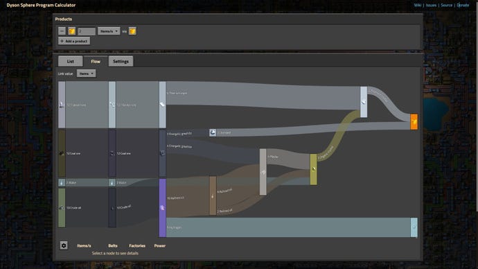 The FactorioLab Dyson Sphere Program Calculator can toggle between List view and Flow view at will.