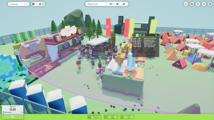 Festival Tycoon is split into two halves: the building stage and the live stage. The building stage is where you will likely spend most of your time because once you hit go on the festival, that’s it. You can’t make changes. No going back. That means, in the first stage, you have to place your stages, set out your camping areas and depressing banks of toilets, slot in the merch and food stalls… andthen,because you’ve run out of money, you have to find sponsors, and then book bands and plan the lineups… It’s… it’s a lot. Impressively granular. I think to do it successfully I’d need to pre-plan playing the game in a notebook, as well.
