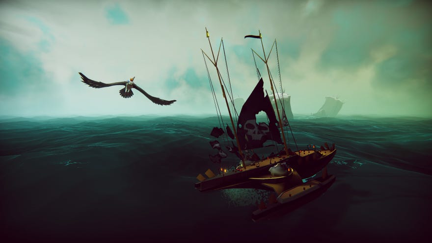 The Falconeer has a lot of combat. There was a honeymoon period where I just flew around exploring, flying for its own sake, landing at ports and occasional shrines (which bring up fully voiced flavour text and unlock some side trinkets). The friendly merchant boats you target sometimes offer escort jobs, which paid surprisingly well for often no combat. There are aerial races to unlock alternative birds, package delivery side jobs, and a brilliant geographical feature calledThe Maw. It’s a huge chasm gouged out of the ocean, with a weird little watery bridge, and for the longest time the game absolutely refuses to explain what it is or how it’s possible. I respect that immensely. It’s part of the world! It’s clearly THE local feature. Why would anyone explain it to you? Do you talk to the postman about what trees are?
