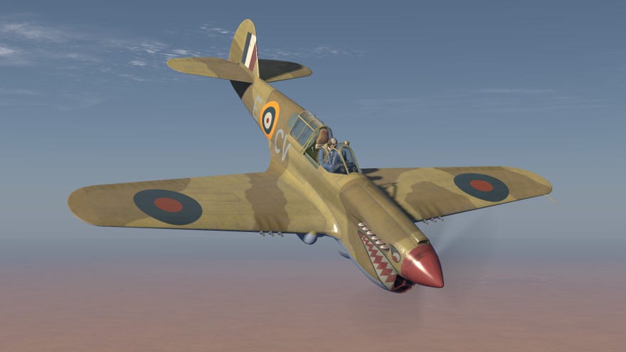 Meet Edwina’s replacement, Evelyn. AKittyhawkrather than aTomahawk, she has six hundred additional pegasi stabled under her engine cowling and all her firepower (6 x .50 Brownings) embedded in her wings. While she couldn’t be described as a Bf 109’sworstnightmare, any Messerschmitt pilot that sees her scarlet spinner and gaping chin scoop looming in his rear-view mirror is likely to wish pretty ardently that he was somewhere else.