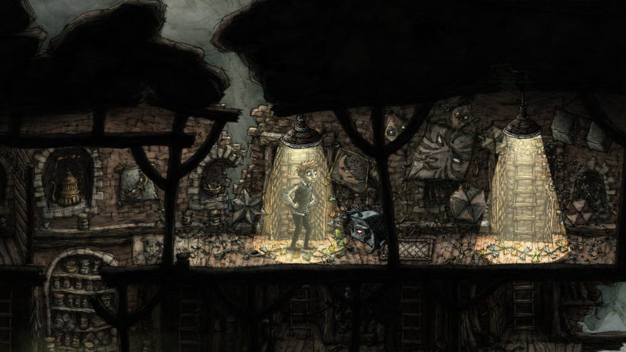 It’s all apparently one huge building, creaking and crumbling as you cross it, and rumbling now and then under the distant movements of some giant creature. It’s also full of robotic dogs that turn into furniture when exposed to light, semi-passive jellyfish that scare the dogs, and sometimes a snuffling birdman in a dressing gown. I’ve no idea what’s going on, but it doesn’t beat you over the head with a narrative. It’s more about enjoying the atmosphere, the lovely music and sounds, and the puzzles.