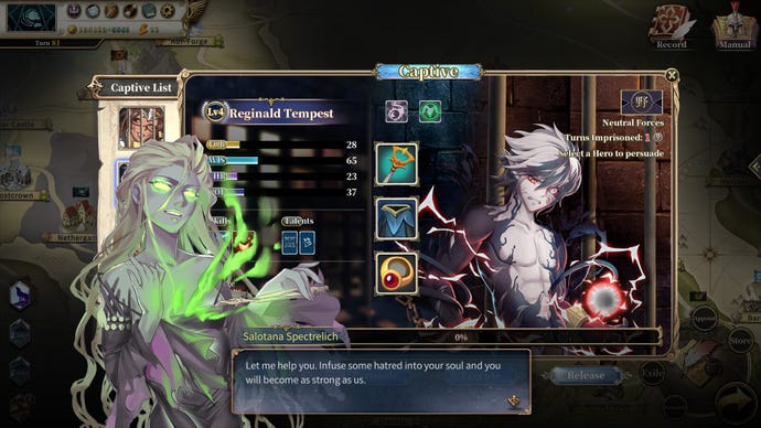 Interestingly, when you capture and turn faction leaders, you also get access to their story missions, and their occasional conversations when facing familiar characters in battle. Wipe out a faction and all its surviving characters are yours, to imprison, execute, or release as you see fit. It’s surprisingly dramatic having to decide then and there which specific people to behead. Entertaining, too, if you’re playing as an evil faction and have developed a dislike for particular people in battle. Imprisoned people can be recruited or, ah, “interrogated” first and then turned. Released ones might join you in gratitude… or turn up fighting for someone else. Gits.