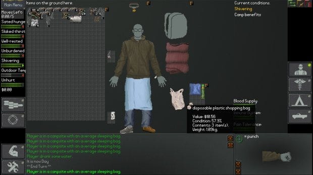We all like to think we’d be the rugged survivor in a post-apocalyptic scenario (the resourceful rangers of Wasteland, the courier of Fallout: New Vegas). But in NEO Scavenger, your character is as underprepared for the collapse of civilisation as you are right now, sitting in your pants eating another bowl of cereal. It’s mostly a game about managing what’s in your pockets, and navigating across tiles on a world map to escape a strange beast that is on your trail. You’re not sure what has happened to the world you’ve woken up in. But the only way to survive is to stuff as many bottles as possible into a plastic carrier bag and keep moving. If you find a shoe, that’s terrific. A second shoe? Unbelievable luck. There are many ways to die in this terrible place (food poisoning, starvation, hypothermia) but none as clumsy, dramatic and pitiful as getting intoa chaotic fist fight with a random stranger. The results of these fights are described to you in lines of text, but it remains one of the most vivid, eyebrow-bursting experiences you can have in a video game.