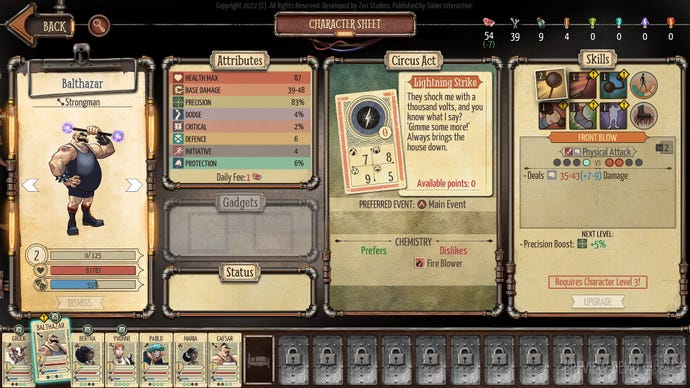 Putting on a circus show plays out as a puzzle-like management mini-game. You need to choose which characters will put on a spectacular show while also trying to stick to the performer’s own preferences. An audience expectation meter displays what the show’s ‘score’ will be and is broken down into four categories: laughter, fun, amazement, and thrill. Character stats and their overall devotion to the circus will affect the meter, with different character combinations making it easier to hit audience expectations.