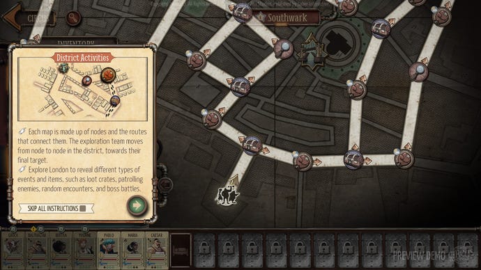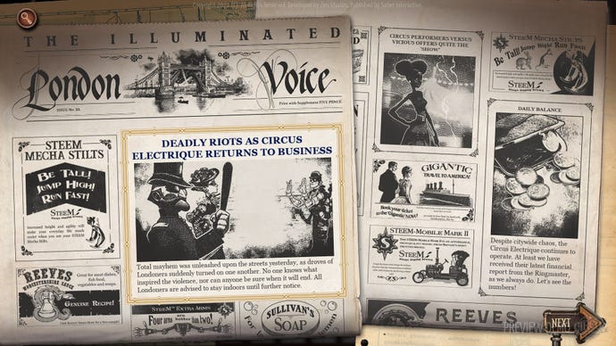 A daily newspaper called ‘The Illuminated London Voice’ acts as a summary of your activities: how audiences found your circus performance, Amelia’s reports on the status of London’s frenzied residents, and more snippets of background info on the game’s world. Details like the newspaper just add to the overall details of what is a very lavishly designed game. The 2D and 3D character models all burst with personality, every piece of dialogue is voice-acted, backgrounds for encounters are always set in different parts of London, and every character attack has a flourish of animation. Every time you put on a show, the game will generate a vintage circus poster with the characters you chose to perform that day. Even the smallest details like HP meters, status symbols and item descriptions, all have their own steampunk flair. I have a soft spot for mechanical and steampunk aesthetics, so after drinking up all the preview’s lavish details I felt almost giddy.